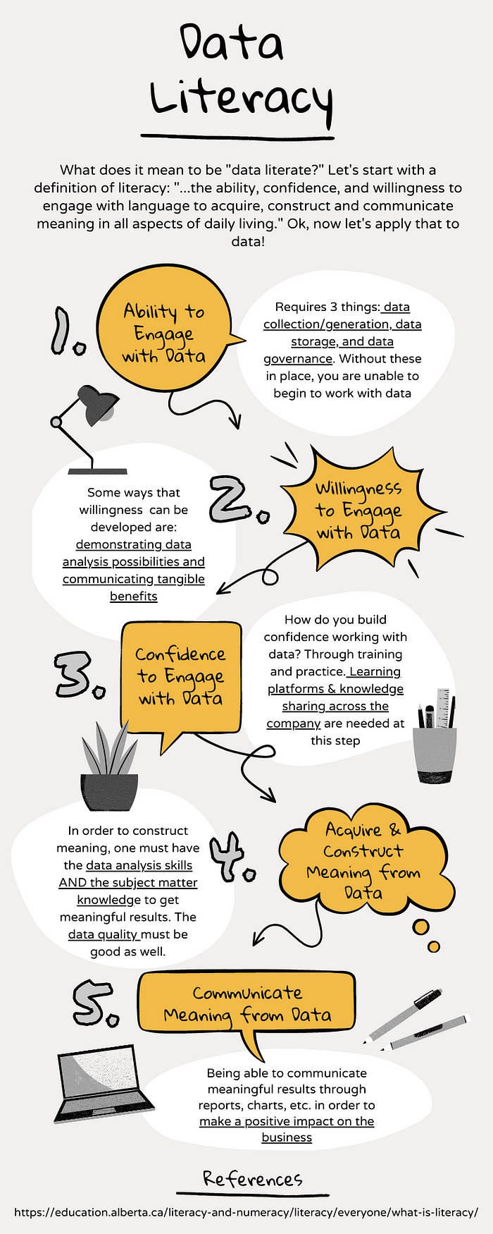 데이터 리터러시를 정의하는 가장 좋은 방법은 리터러시의 정의로 시작한 다음 데이터 세계에 적용하는 것이라고 생각합니다. 일반 리터러시는 내가 더 친숙한 개념이기 때문에 주제를 이해하는 데 도움이 되었습니다. Alberta Education은 문해력을 다음과 같이 정의합니다.